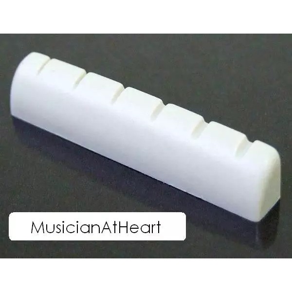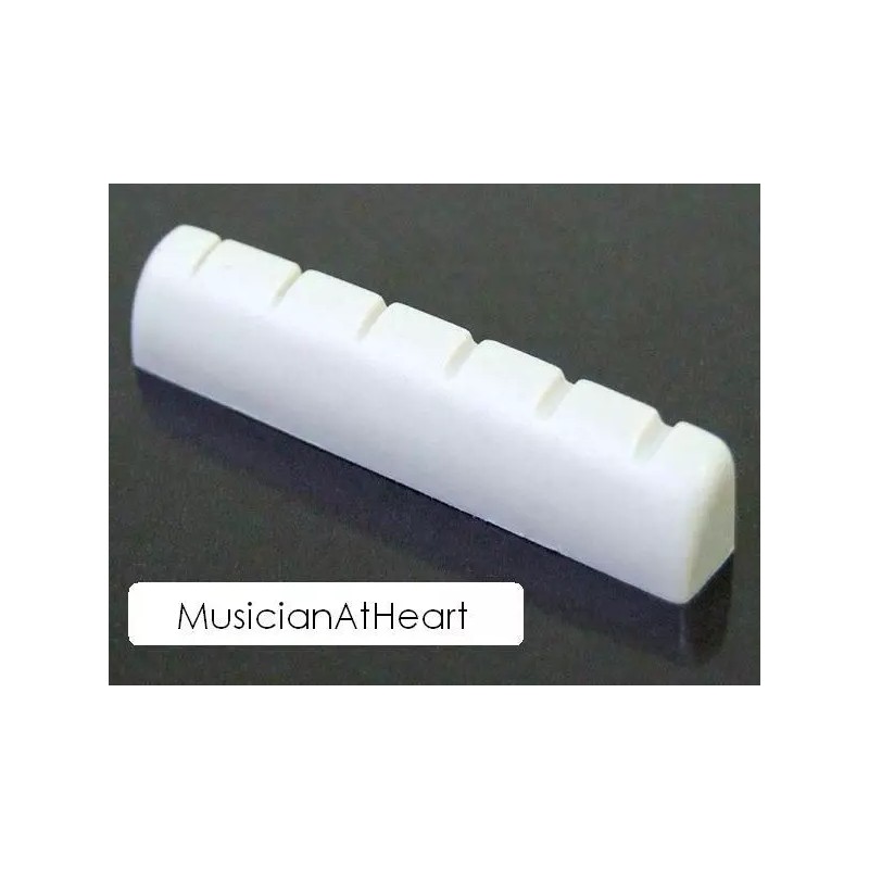 Our nut is hand ground and sanded from solid COW BONE and round-slotted for perfect string placement. Length 1.69", height .34", thickness .25".
