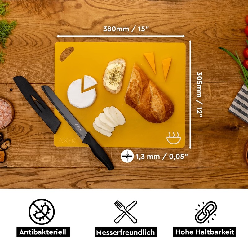 - Easy to store: the large chopping board (37.8 cm x 30.2 cm) makes it easier to work when preparing dishes. When not in use, it takes up little space. They also have holes for hanging.