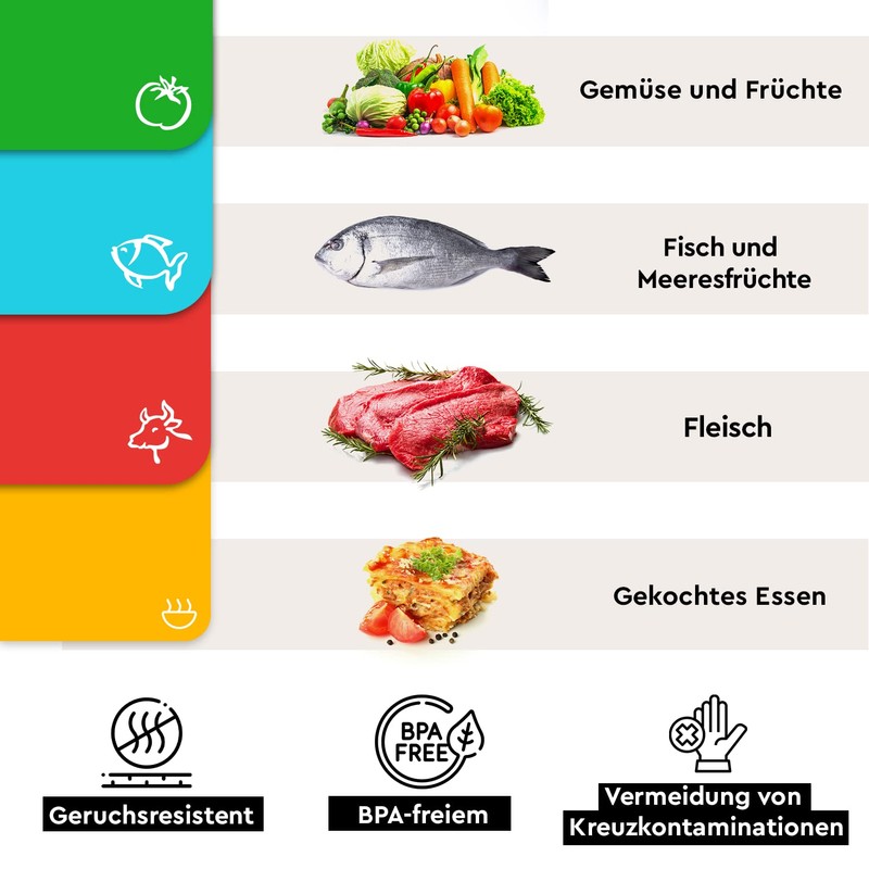 - Avoid cross contamination – 4 colour-coded cutting mats with food symbols (meat, vegetables, fish, cooked food). They help you prevent cross contamination and mixing different foods.