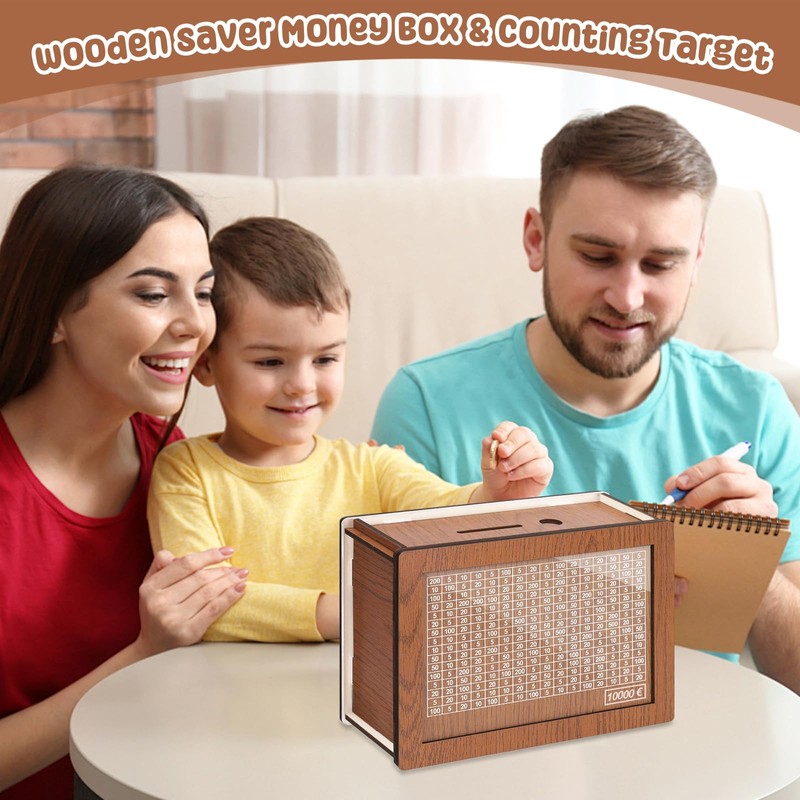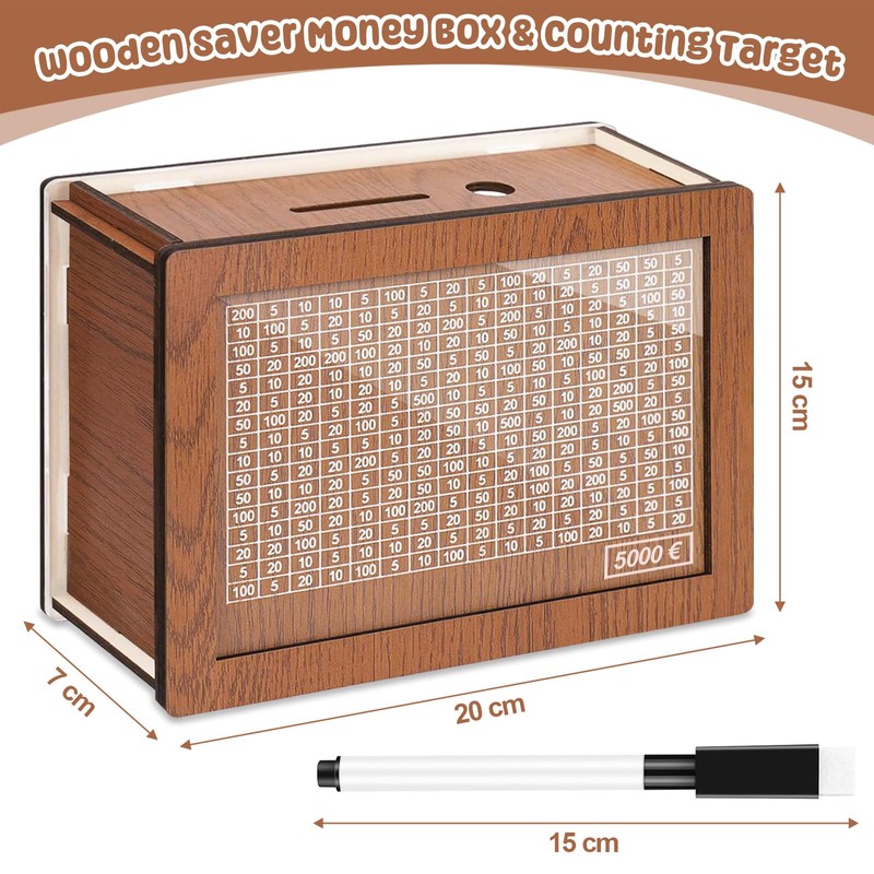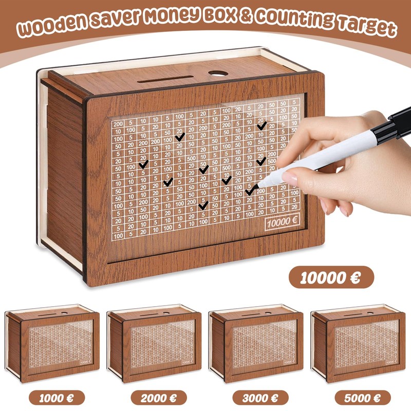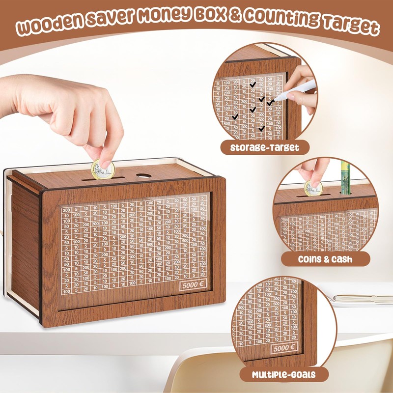 Axinyijia Wooden Money Box, Reusable Money Box with Counter, Piggy Bank with Marker for Children, Adults, Money Saving Box
