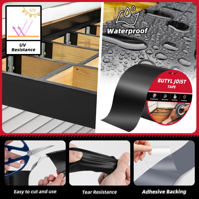 • 【Waterproof & Preservative Tape】The deck joist tape with a butyl adhesive, forms a protective barrier for wood, joists, plastic and more, helping to prevent water damage, rot, and decay, thereby extending their lifespan. Suitable for both indoor and outdoor applications.