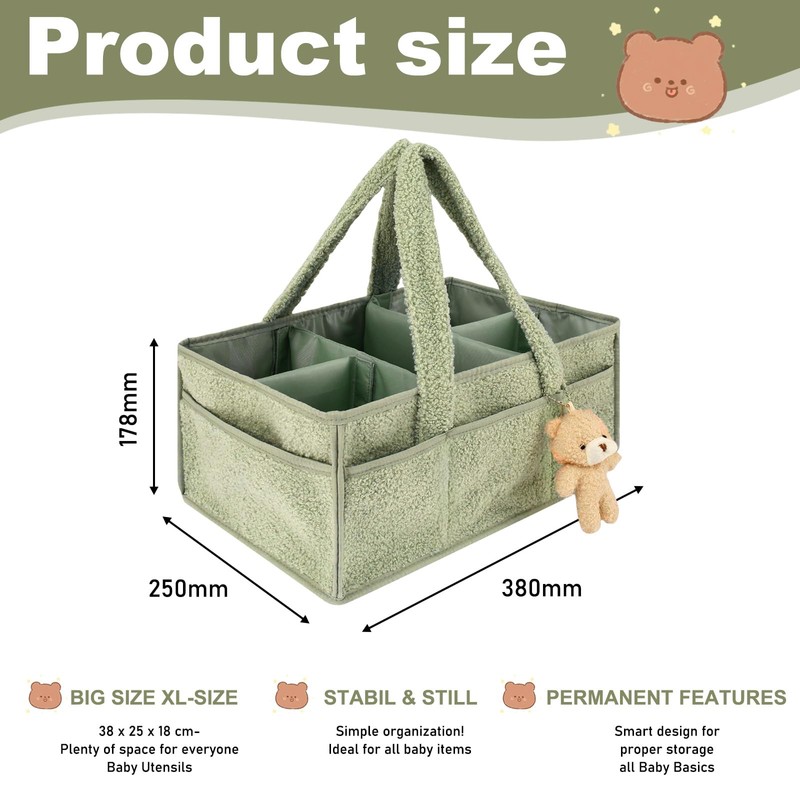 - Optimised storage space: the intelligent changing organiser offers thoughtful division with multiple compartments and double closure. The practical plush changing organiser with small handles allows clear storage of all changing utensils - from nappies to wet wipes to creams. The portable changing basket with removable compartments keeps everything handy for quick nappy changes, whether day or night.