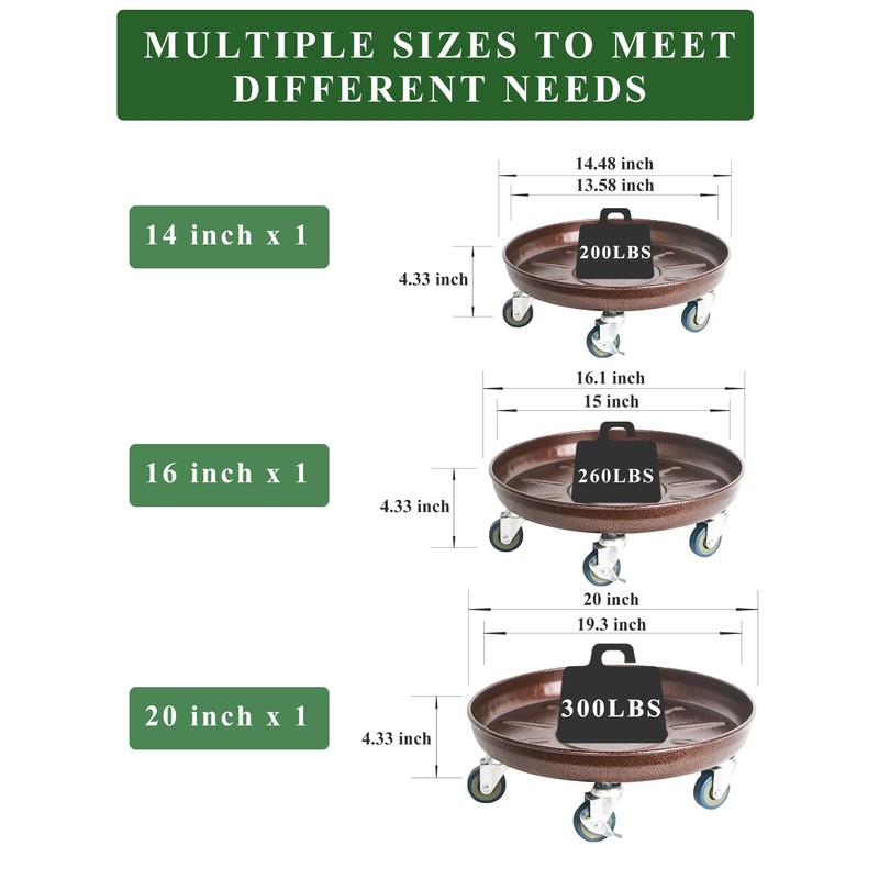 - PLANT CADDY MIXED SET:The rolling plant caddy mixed set offers 3 practical sizes: 12", 14", and 16". You'll easily find the suitable size fit for your needs, saving you the trouble of finding the right-sized Plant Dolly. Try it out now and experience the simplicity and beauty it can bring to your daily life.