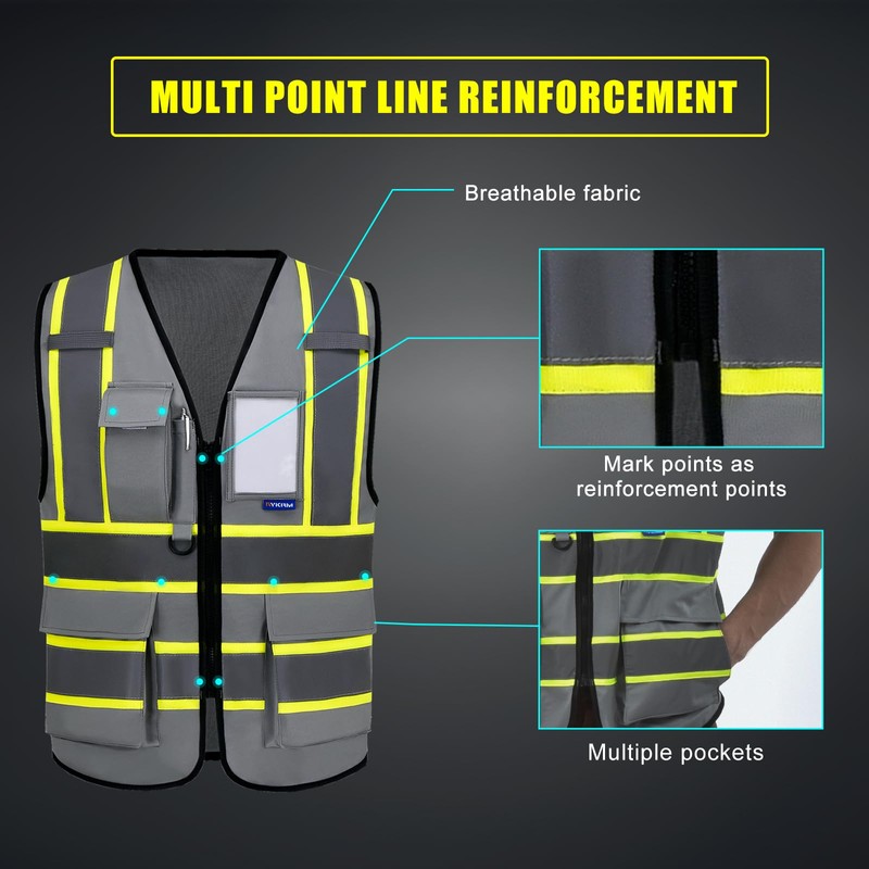 - ✅【POCKETS】vest Zipper front closure and 7 pockets were reinforced with tight sewing, with two durable mic tabs on the shoulder to hold your radio/walkies. grey webbing, sturdy, wear resistant. It comes with a pocket window to keep your ID badge. A D-Ring. A pouch for flashlight/pen/pencil. A small but expandable Velcro flap closure pocket. And 2 Large expandable snap-button utility pockets with two side hand-insert pockets underneath. A bright HI VIS safety vest with pockets.