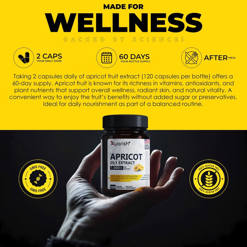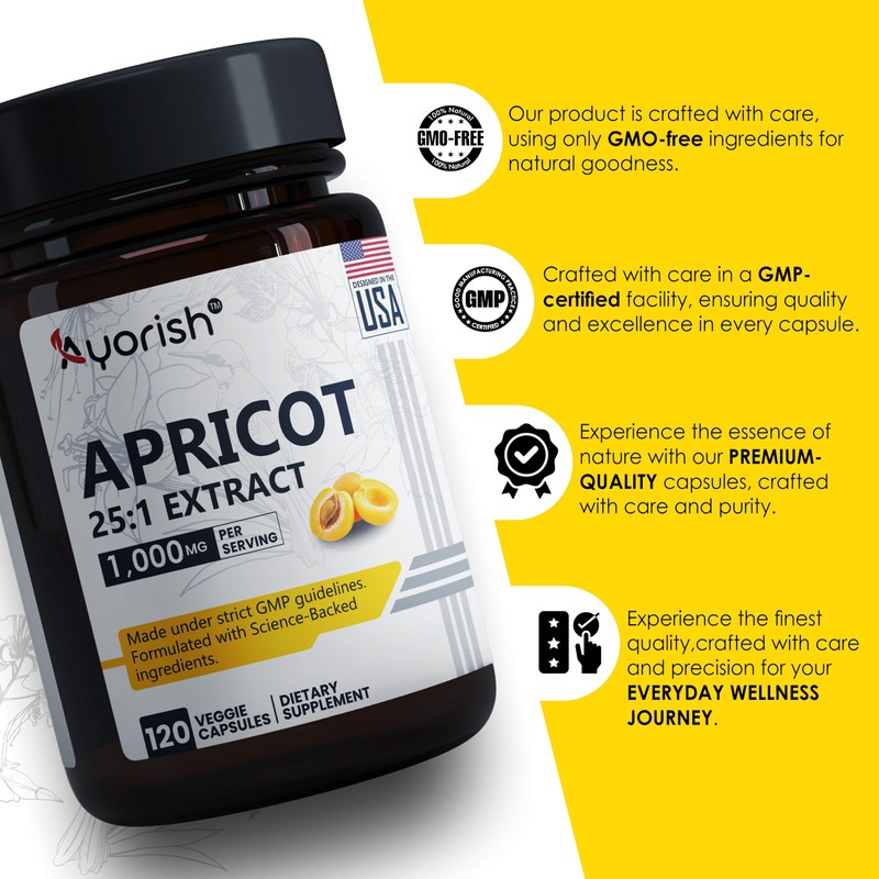 Ayorish Apricot Extract 25:1 (120 Capsules) 500 mg per Capsule, 1000 mg Per Servings Immune Support Herbal Supplements (Pack of 1)