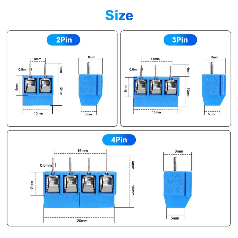 AYWHP PCB Screw Terminal Block, 5 mm Pitch Blue 2 Pin / 3 Pin / 4 Pin 300 V 16 A Soldering Terminal Block Compatible with Arduino DIY Electronics Projects (80 x 2 Pin, 15 x 3 Pin, 5 x 4 Pin)