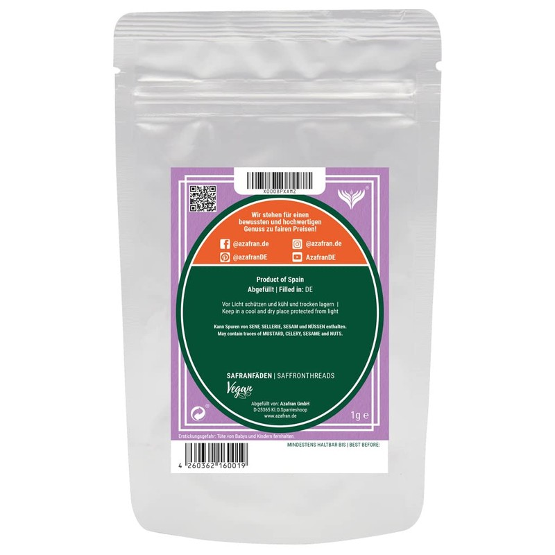 - The spice is packed in an aroma bag and is suitable for a saffron risotto, paella or as saffron tea or addition in gin.