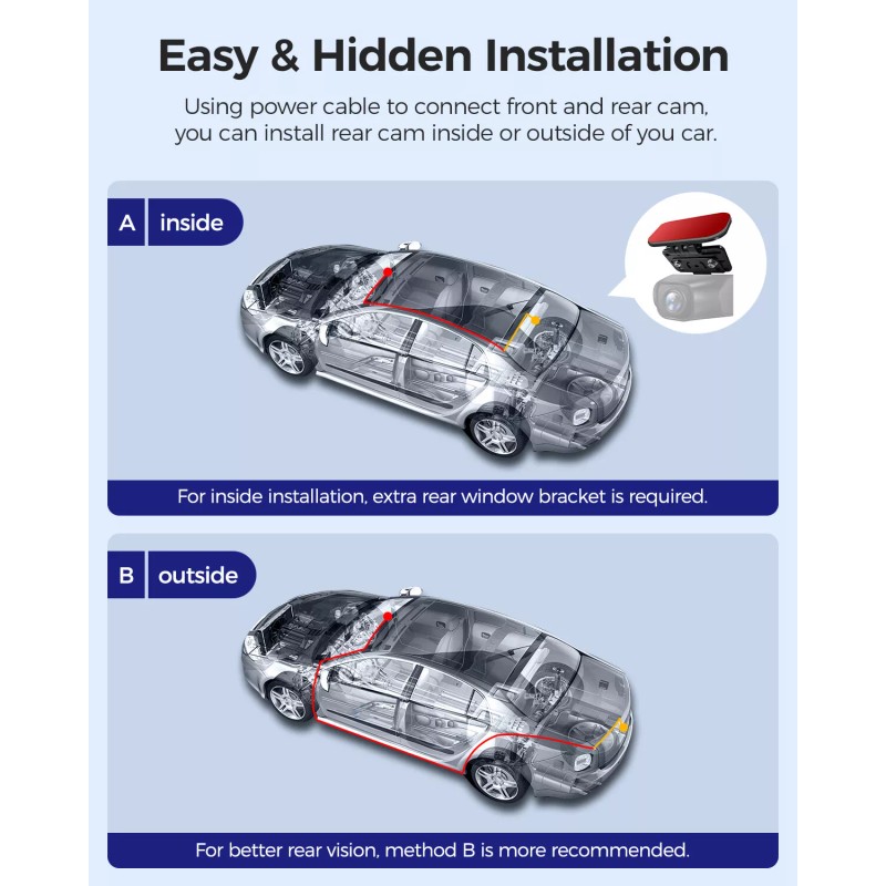 | IP68 Waterproof & Adjustable Rear Cam AZDOME M550 Max rear camera needs to be installed outside the car. Equipped with an IP68 waterproof rear camera, it is extremely durable and enhances overall driving safety and monitoring capabilities. This rear dash camera adds the latest exclusive functions, which can provide you with mirror flips of the picture. You can adjust it according to your actual situation, so it can be perfectly compatible with pickups, RVs, and trucks. |