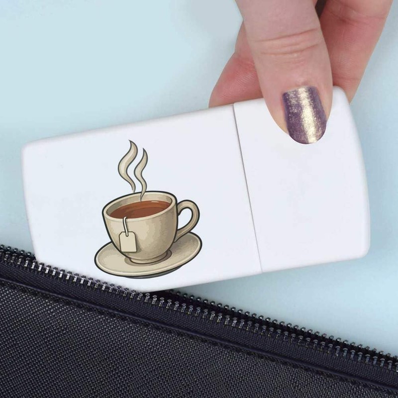 'This appealing design depicts a steaming hot cup of tea with a teabag, evoking feelings of warmth, comfort, and relaxation.'