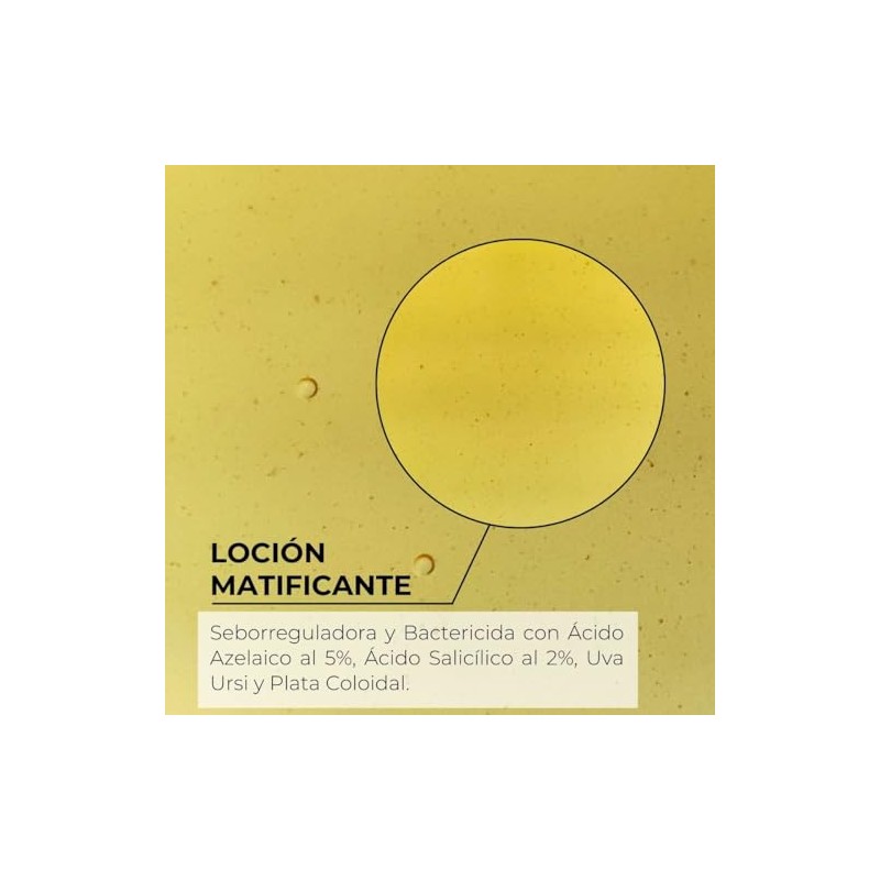 - Loción Seborreguladora, Matificante y Bactericida a base de Ácido Azelaico al 5% y Ácido Salicílico al 2%. Es ideal para pieles grasas y con tendencia acnéica además de ser muy adecuada para evitar la queratosis (piel de gallina), los problemas relacionados con el afeitado o la depilación pues evita que los vellos se encarnen, reduce el rubor, el enrojecimiento y desinflama. El ácido Azelaico es un ácido de origen natural derivado del centeno, el trigo y la cebada, este ingrediente es anti