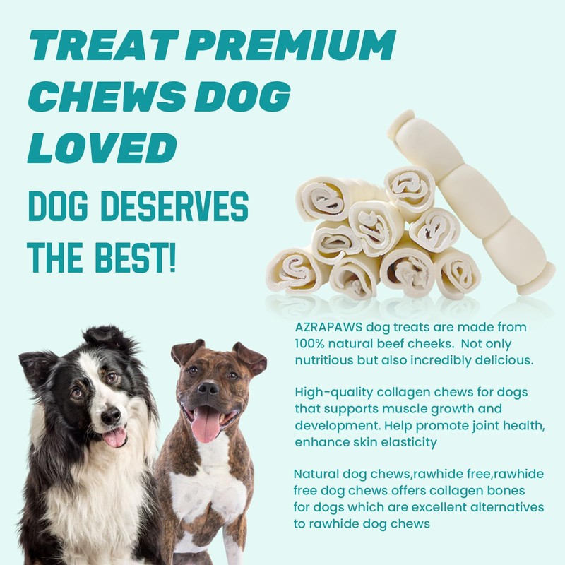 • Beef Cheeks Dog Treats - AZRAPAWS dog treats are made from 100% natural beef cheeks. These natural collagen dog chews are sourced from the highest grade all natural free raised and grass fed beef. Not only nutritious but also incredibly delicious, beef cheek rolls providing a savory, meaty taste your dog can’t resist.