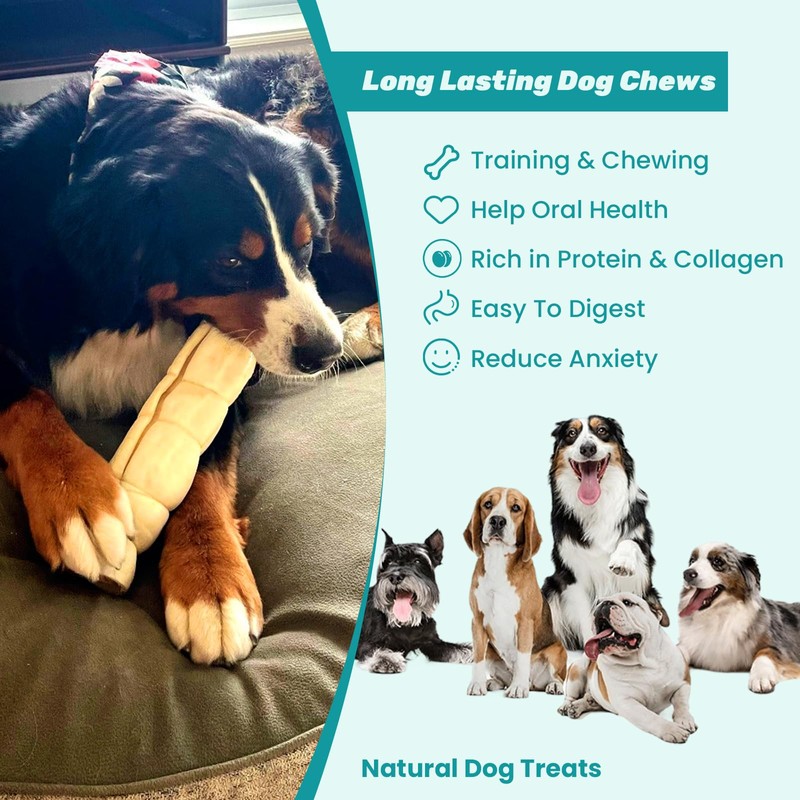 • Long Lasting Dog Chews - Beef cheeks collagen sticks for dogs are not only the dog chews for aggressive chewers large dogs but also for medium dogs, dog chews are the perfect way to combat boredom and anxiety. Long lasting dog chews keep dogs busy and happy, strengthens jaw muscles and relieves stress and helps dogs focus on something positive.