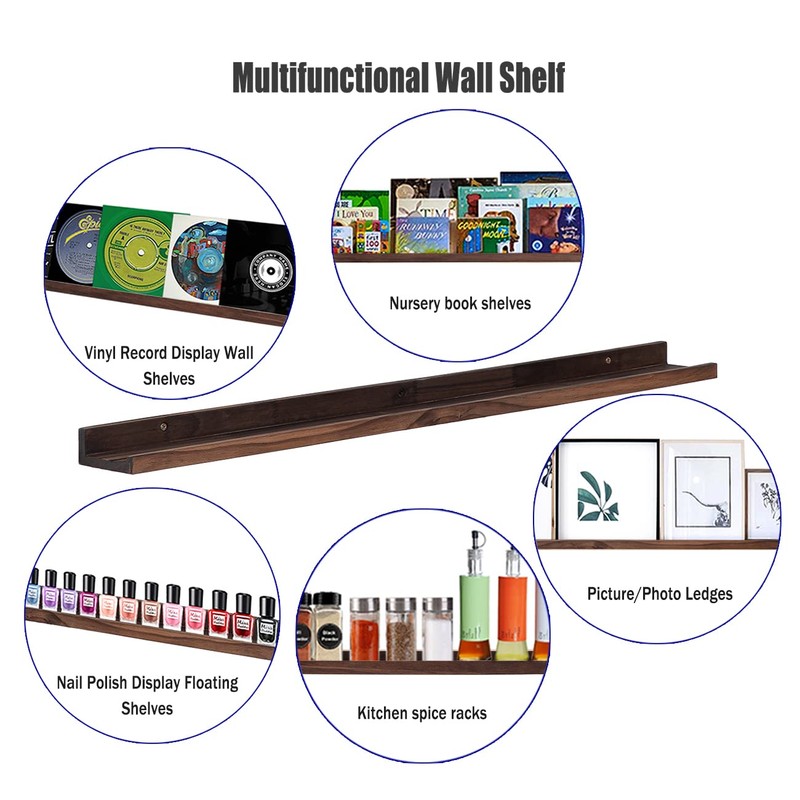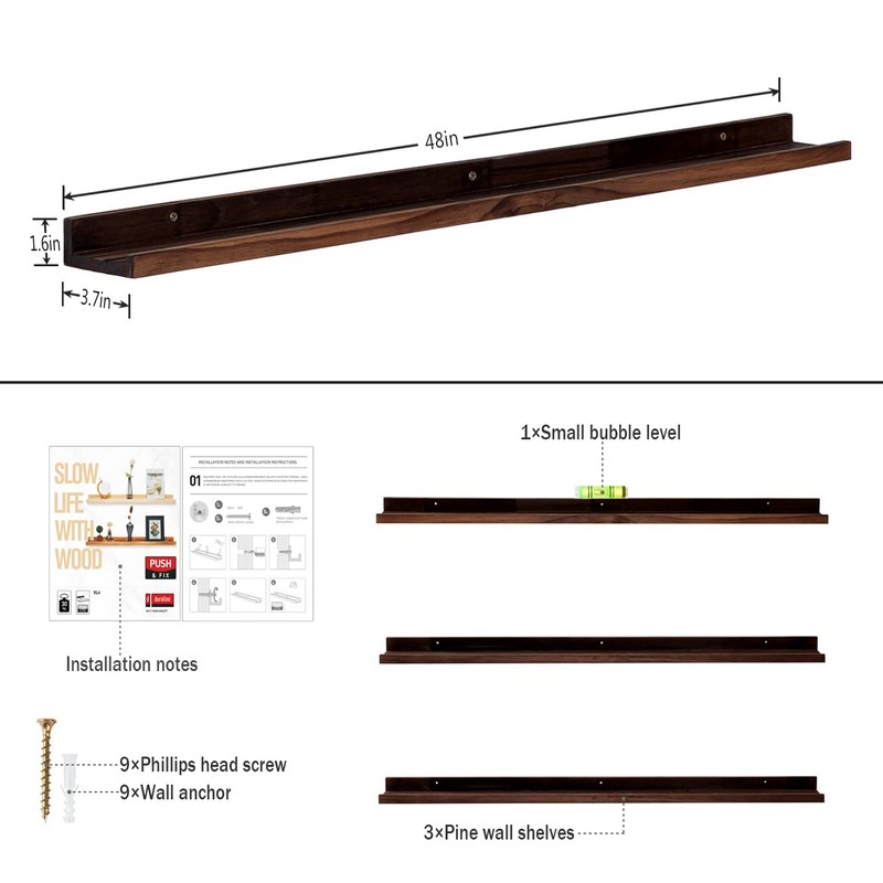 - Premium Wall Shelf:The size of photo ledges is 48 in x 3.7 in x 1.6 in.Made from 100% solid wood and handcrafted so these floating wall shelves are built to last. Perfect for displaying potted plants, family photos, collectibles, etc. However, wood color may vary slightly due to the light weight of the wood burning process.