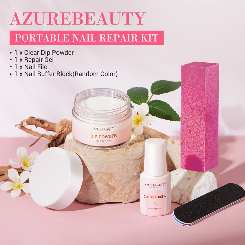 - What U Get: Portable nail repair kit comes with 1* Clear Dip Powder(1 Oz/28g), 1*Quick-Drying Repair Glue(10 ml), 1*Nail File, 1*Nail Buffer. To repair broken and crack nail tips, AZUREBEAUTY provides a perfect solution for you! Say goodbye to split & weak nails