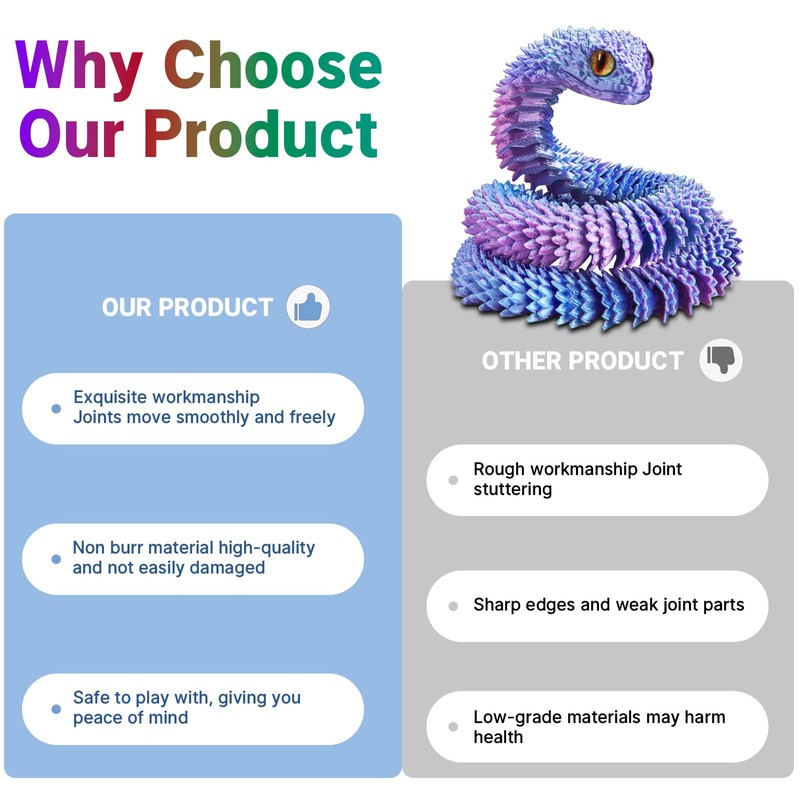 - Fidget toys for adults and children and 3D figures snake: These 3D printed snakes are not only fun for children, but also a great addition to any collection. The creative design and attention to detail make it a sought-after piece for dragon enthusiasts. They are also perfect as a gift for Christmas, Easter or birthdays.