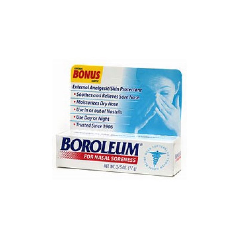 DRY NOSE RELIEF Medicated Boroleum is a versatile nose care ointment which provides moisturizing and soothing relief for nasal soreness related to stuffy nose. Also suitable for the temporary relief of pain and itching associated with minor burns, sunburn, minor cuts, scrapes, insect bites, and minor skin irritations. SOOTHES NASAL SORENESS There's nothing worse than that raw, cracked, itchy nasal skin you get from a bad cold or chronic congestion. Boroleum provides soothing relief from redness, itchiness and nasal soreness caused by cold and nasal allergy symptoms, as well as nasal pain caused by cold, flu or runny nose. GENTLE NOSE MOISTURIZER Our time-tested blend of ingredients gently softens, soothes, and moisturizes dry, cracked or raw nasal skin. It can also be used to soothe chapped skin or lips caused by harsh temperatures, winter or summer - an ideal skin protectant whether you're skiing, snowboarding, boating or even spending the day at the beach! SUITABLE FOR ADULTS & CHILDREN Gentle enough for children from age 2, strong enough for adults, Boroleum is a versatile and effective nasal moisturizer for dry nose. A small dab of Boroleum goes a long way in relieving discomfort from nasal soreness and raw or cracked facial skin. External Analgesic skin protectant. Not to be ingested. Can be used day or night. TRUSTED SINCE 1906 Boroleum has been a household staple in American homes for over a century, used and trusted by four generations of families. Whether you keep a tube in the glove compartment of your car, in your purse, or even your pocket, Boroleum quite simply helps you feel your best!
