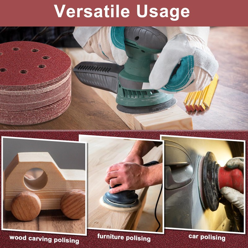 - 【Sanding Discs 5 Inch 8 Hole】Sandpaper is widely used for furniture, automobile, machinery, hardware, yacht and other industries, and is very suitable for metal and non-metal materials, rust removal, paint removal, burr removal, etc.