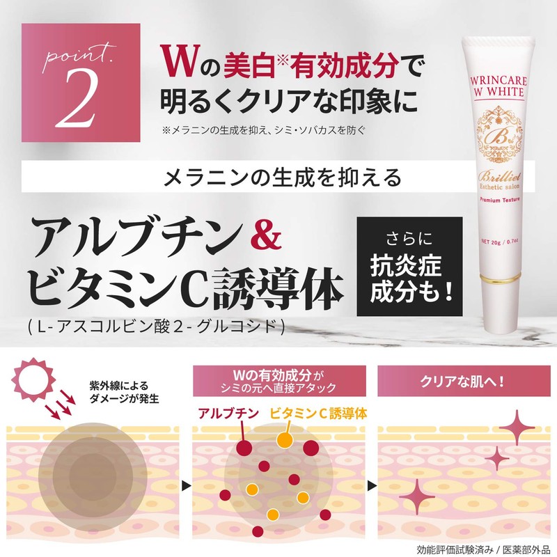 - (3 Types of Active Ingredients) Linkare W White Wrinkle Cream contains 3 active ingredients. Albutine: L-Ascorbic Acid 2-Glucoside... and 2K Glycyrrhizinate are an approach to skin problems such as discomfort and freckles. Whitening: Formulated with whitening active ingredients that suppress the production of melanin and prevent stains and freckles. Prevents small wrinkles caused by drying (*Efficacy tested.) (*(*Tested): Vitamin C derivatives, pineapple juice extract, and bilberry extract)