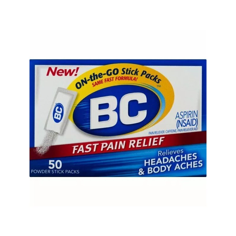 BC™ Fast Pain Relief Aspirin Powder Stick Headaches & Body Aches. An aspirin (NSAID) pain reliever & caffeine pain reliever aid on-the-go stick packs. Temporarily relieves minor aches and pains due to headache, toothache, menstrual cramps, minor arthritis pain, muscle aches, colds.