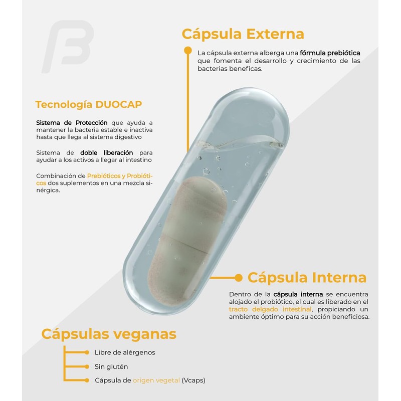 - Bfit trabaja con una tecnología de primer nivel, en la que los PRE bióticos se encuentran en la cápsula externa y contiene 1 BILLÓN de PRO bióticos en la cápsula interna, asegurando que estos últimos, llegan vivos a su lugar de destino dentro de nuestro cuerpo. Tomar solo 1 cápsula al día.