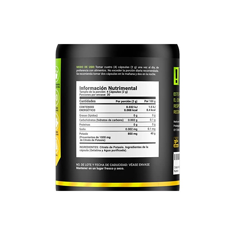 B Life Company Citrato de Potasio 800 mg de Potasio (Provenientes de 1000 mg). Ingredientes Naturales de 120 Cpsulas. Potassium Citrate