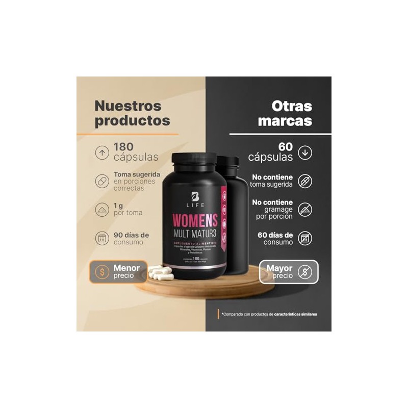 🌟 ⭐ B Life Company Multivitamínico para Mujer Mayor de 40 años con 180 Cápsulas. Ingredientes naturales: Colágeno, Inositol, Maca, Probioticos. Womens Mult Matur3 ⭐ 🌟