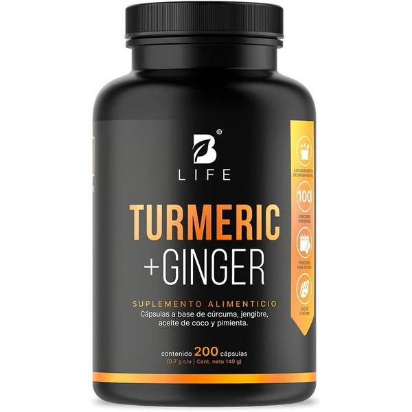 B Life Cúrcuma Con Jengibre y Aceite De Coco | 200 Cápsulas | 1400 mg por porción | Adicionado con Pimienta Negra | Turmeric + Ginger.