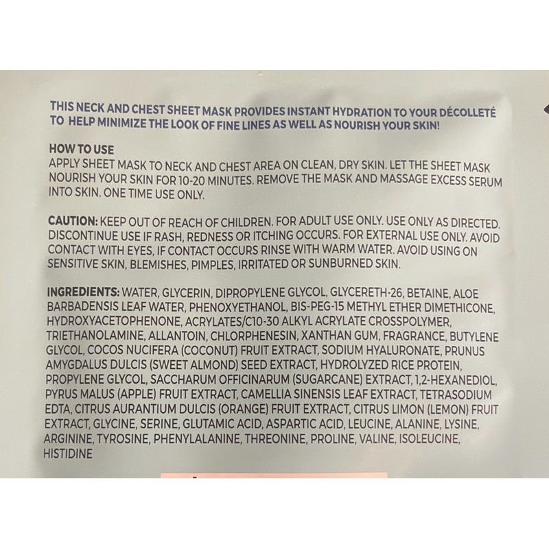 This neck and chest sheet mask provides instant hydration to your Decoty to help minimize the look of fine lines as well as nourish your skin.