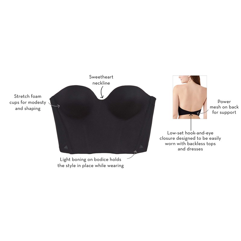 - Backless Strapless Bra with stretch foam cups for modesty and shaping