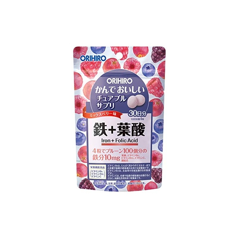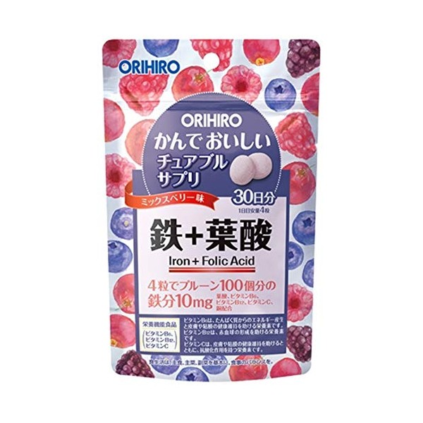 ビタミンB6、ビタミンB12、ビタミンCの栄養機能食品です。鉄分を美味しく摂取できる、ミックスベリー味のチュアブル製品です。1日目安量4粒でプルーン100個分の鉄分10mgが補給できます。葉酸、ビタミンB6、ビタミンB12、ビタミンC、銅配合。栄養機能食品。