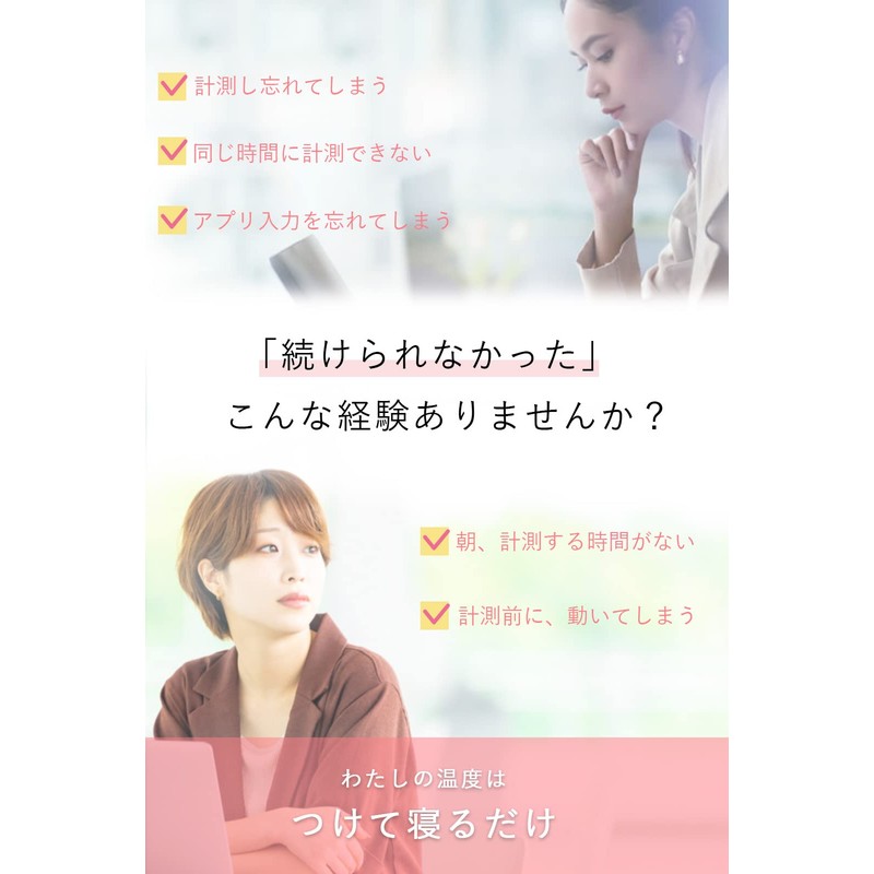 - 【つけて、寝るだけ、計測の煩わしさはもうありません】自分の温度リズムを毎日決まった時間を測定し、記録できるウェアラブルデバイス。寝ている間に女性の温度リズムを自動計測するデバイスです。