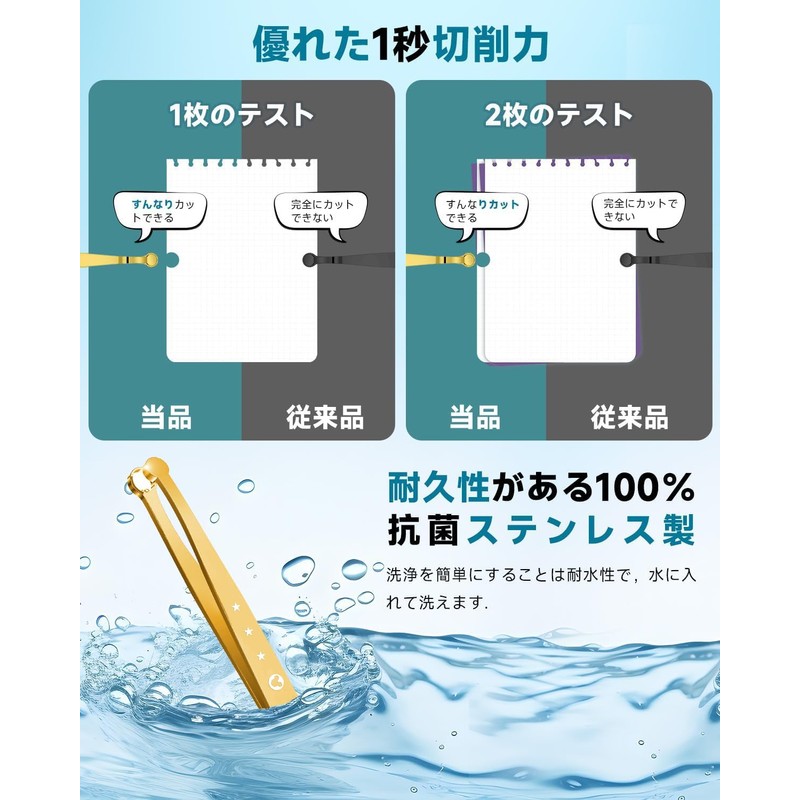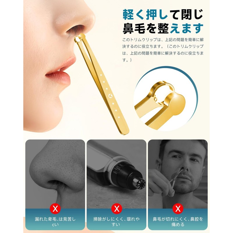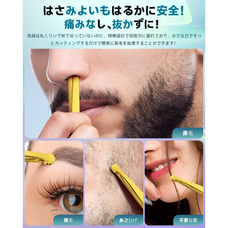 - 【特殊設計で簡単キャッチ&カット】 ハサミの役割を担うメインリングは先が尖っておらず、一見すると毛抜きのような形をしています! 先端は丸くリング状で尖っていないのに、特殊設計で切削力に優れており、小さな力でそっとカッティングするだけで簡単に鼻毛を処理することができます!