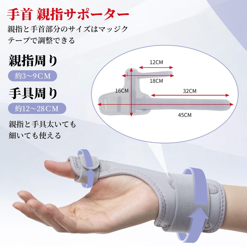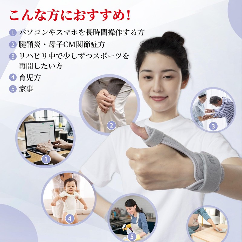 - 腱鞘炎 サポーター:プレートやマジックテープで親指と手首を固定出来るので、痛を緩和できます。首と親指の固定、保護など、過度な動きを制限しサポートします。ソコン作業や育児など、手を酷使する人におすすめです。