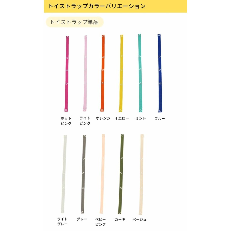 - ☑シンプル簡単。ボタンで取り付けるだけのトイストラップです。トイストラップがあれば、一人遊びでも落とさない。落下防止に活躍します。