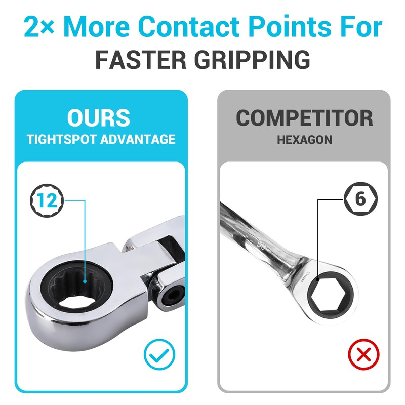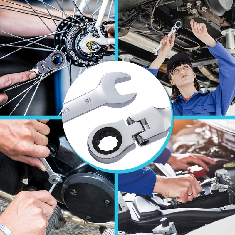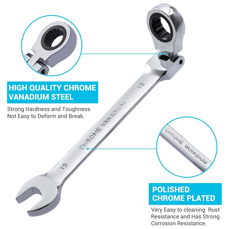 - FLEX-HEAD DESIGN: 180 degree rotating flexible heads of ratcheting wrench set allow you to apply leverage at any desired angle and get around obstructions; 72 teeth ratchet gear needs a minimum of 5 degree swing arc which make it easy and convenient to deal with hard-to-reach areas