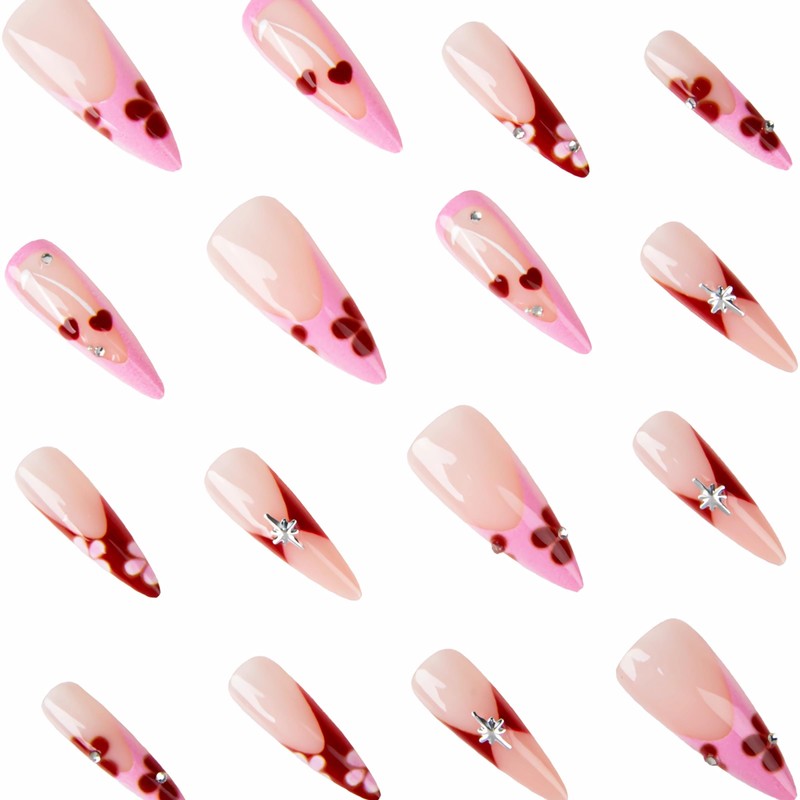 BABALAL Press On Fake Nails Cherry Design Acrylic Nails Long, Stiletto Shape, Pink Red, Glossy, 24pcs, Reusable, False Nails, With Glue