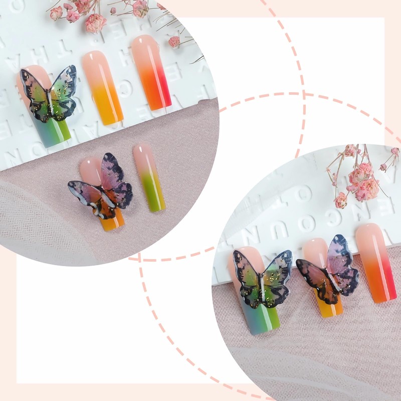 BABALAL Press on Nails Long - Square Fake Nails, Colorful Summer Acrylic Nails Supplies, Butterfly Charm Design Handmade False Nails with Glue 24Pcs Manicure Stick on Nails Squoval Artificial Nails
