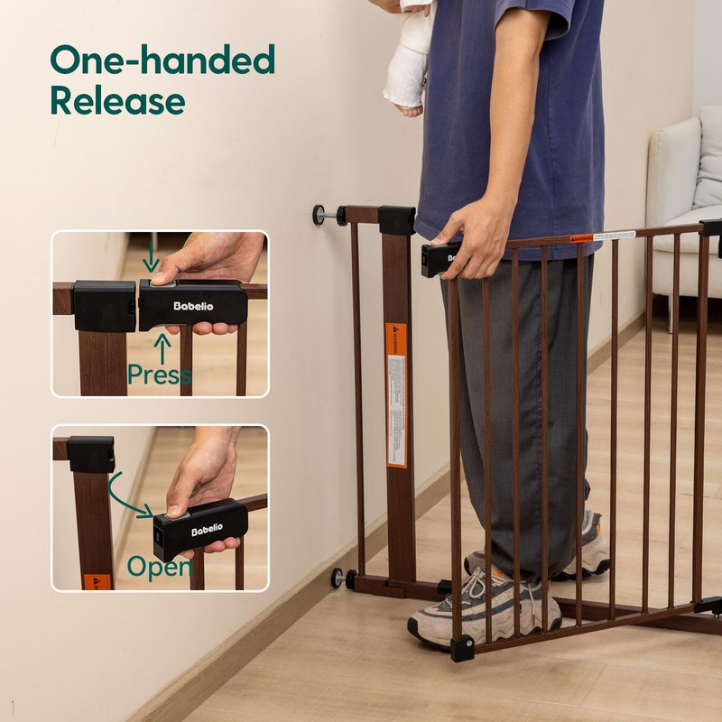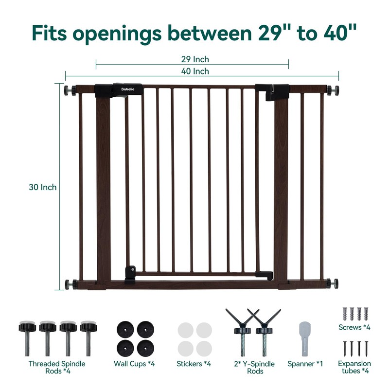 BABELIO 29-40" Metal Baby Gate with Black Wood Pattern, Auto Close Dog Gate for The House、Stairs and Doorways, Pressure Mounted Pet Gate with Door, with Wall Protectors and Extenders