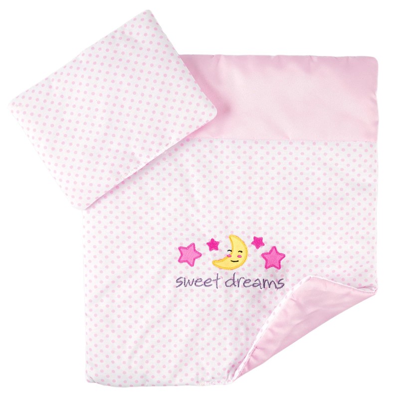 BABESIDE 2 Pcs Baby Doll Bedding Set for 12-15 Inch Dolls, Pink Polka Dot Baby Doll Blanket and Pillow Set with Cute Moon & Stars Pattern for Bitty Baby Doll Accessories