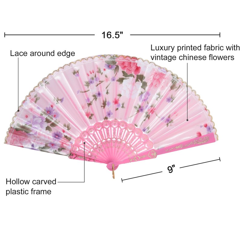 - Floral hand fan size: Length 9 inches; Opened Width 16.5 inches.