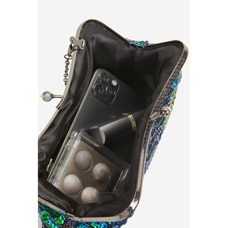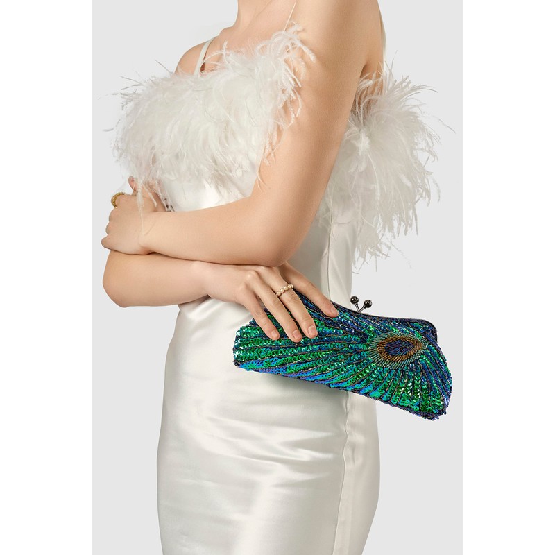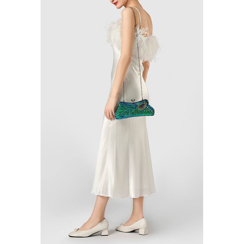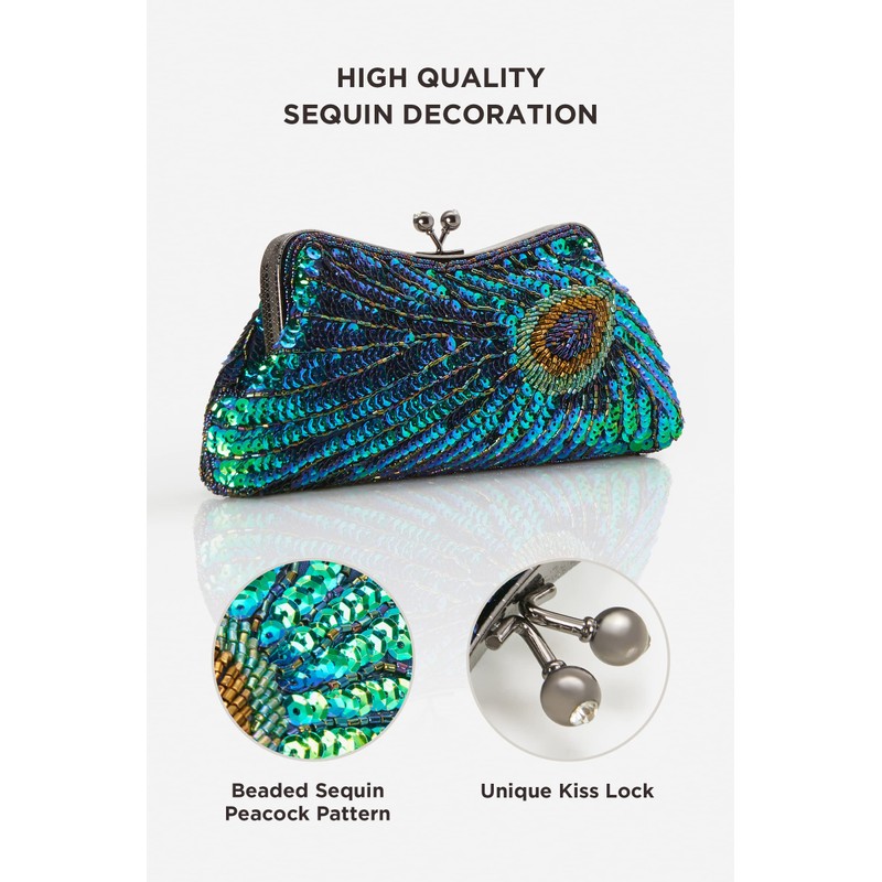 - Design: Featuring hand beaded sequin peacock pattern, this evening clutch will sparkle with different colors depending on angles. Two detachable chains enable it to be held or hung on hand as your please.