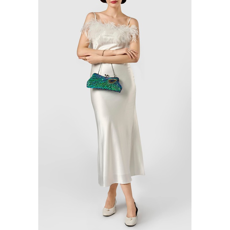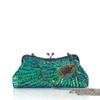 Design: Featuring hand beaded sequin peacock pattern, this evening clutch will sparkle with different colors depending on angles. The detachable chain enables it to be held or hung on hand as your please.