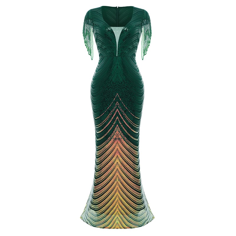 - Features: Bodycon silhouette; V neck; zipper closure; sequin fringe sleeves; layered sequin decorations; floor length.