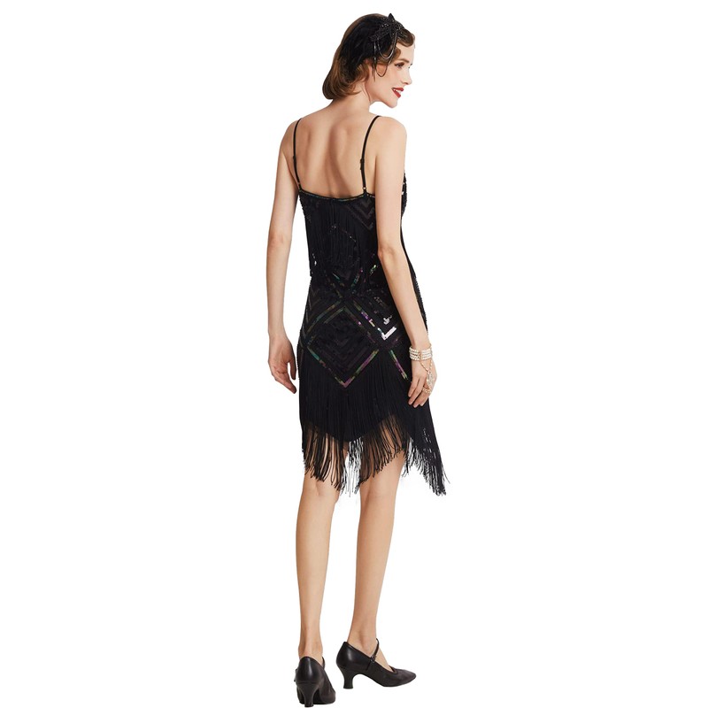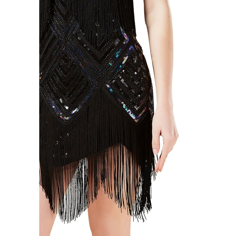 - Design: Classic 1920s striped design with sequins and beads accents for a charming pattern. The chest line and bottom hem are trimmed with long tassels to flatter the sexy and glamorous body line.