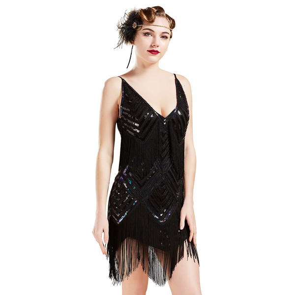 BABEYOND Women's 1920s Flapper Dress V Neck Slip Dress Roaring 20s Great Gatsby Dress for Party (Black, l)