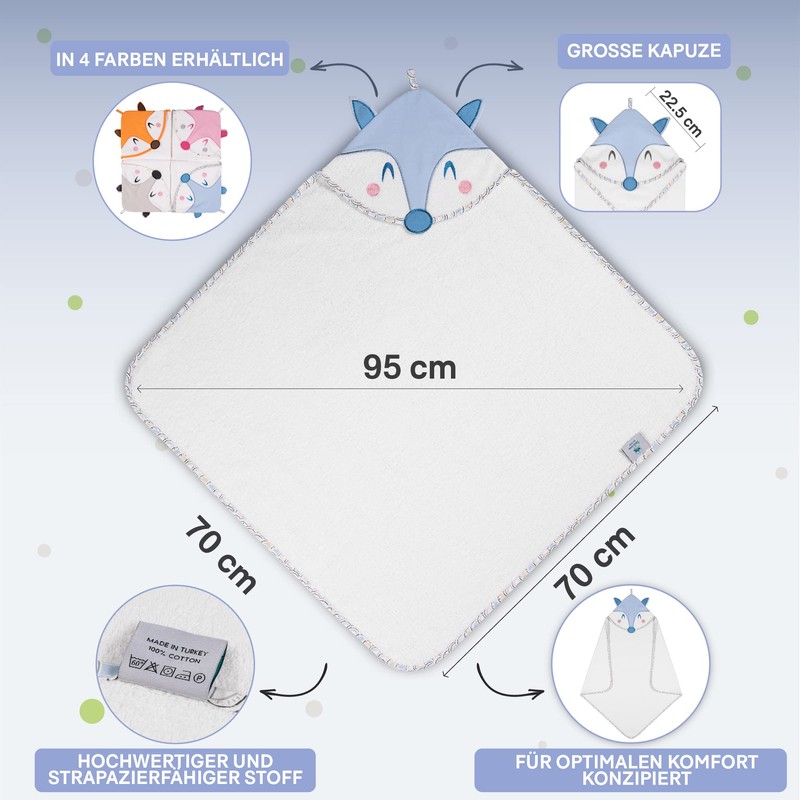 - Ideal for babies and newborns – thanks to its dimensions of 70 x 70 cm, the hooded towel from Sweety Fox is ideal for babies and newborns. The bath poncho is the perfect size for babies from 0 to 12 months. Our baby bath towels are one of the must-haves for initial equipment and accompany your baby during their first months of life.