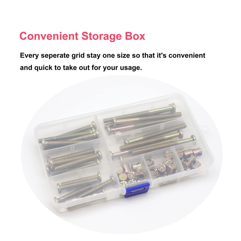 - Package: 25 * Bolts, 25 * M6 Barrel Nuts , with one clear plastic storage box;