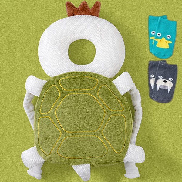 Baby Head Protector Saftey Cushion for Walking Crawling Toddlers Learning to Walk Backpack With Adjustable Strap, Socks, Green Turtle Pattern