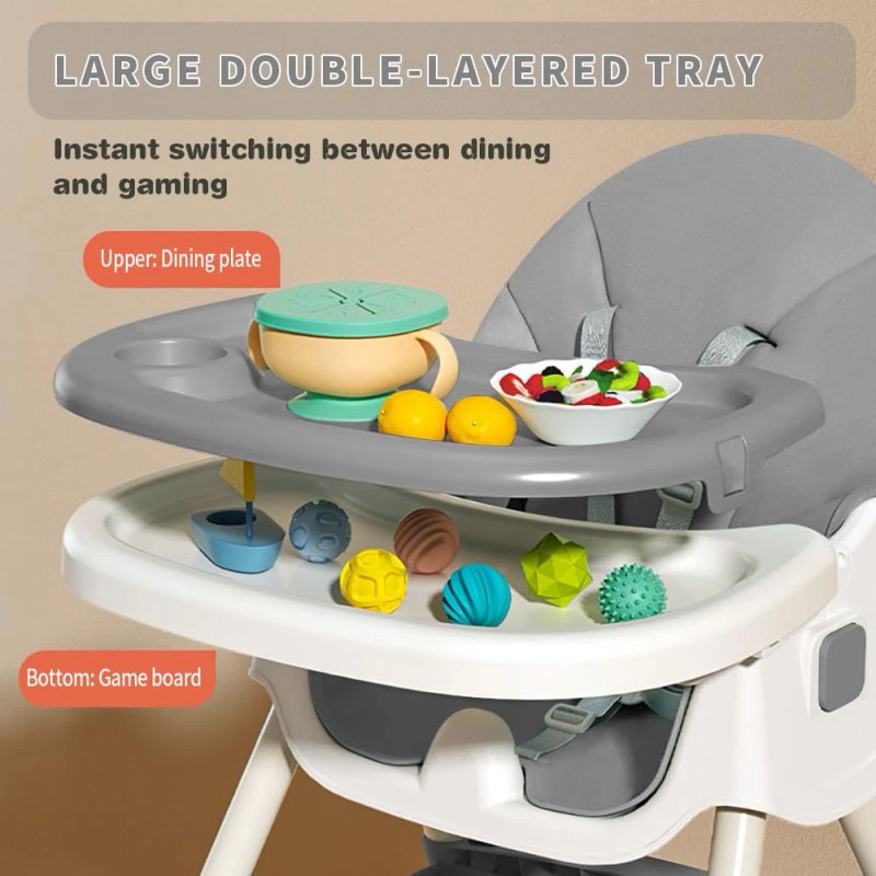 - [EASY TO CLEAN AND STORE] We are well aware that taking care of babies is such a huge and complex task, so quick cleaning and storage is essential, the double removable tray allows for cleaning without baby having to leave the baby feeding chair. The PU leather cushion is waterproof and can be quickly cleaned by simply wiping down with a dry cloth or wet wipe. The compact foldable high chair can be folded away in a matter of seconds to save space when not in use.