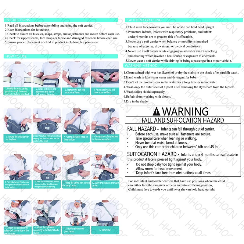 The baby hip seat carrier is made of skin friendly polyester fiber and breathable polypropylene material.